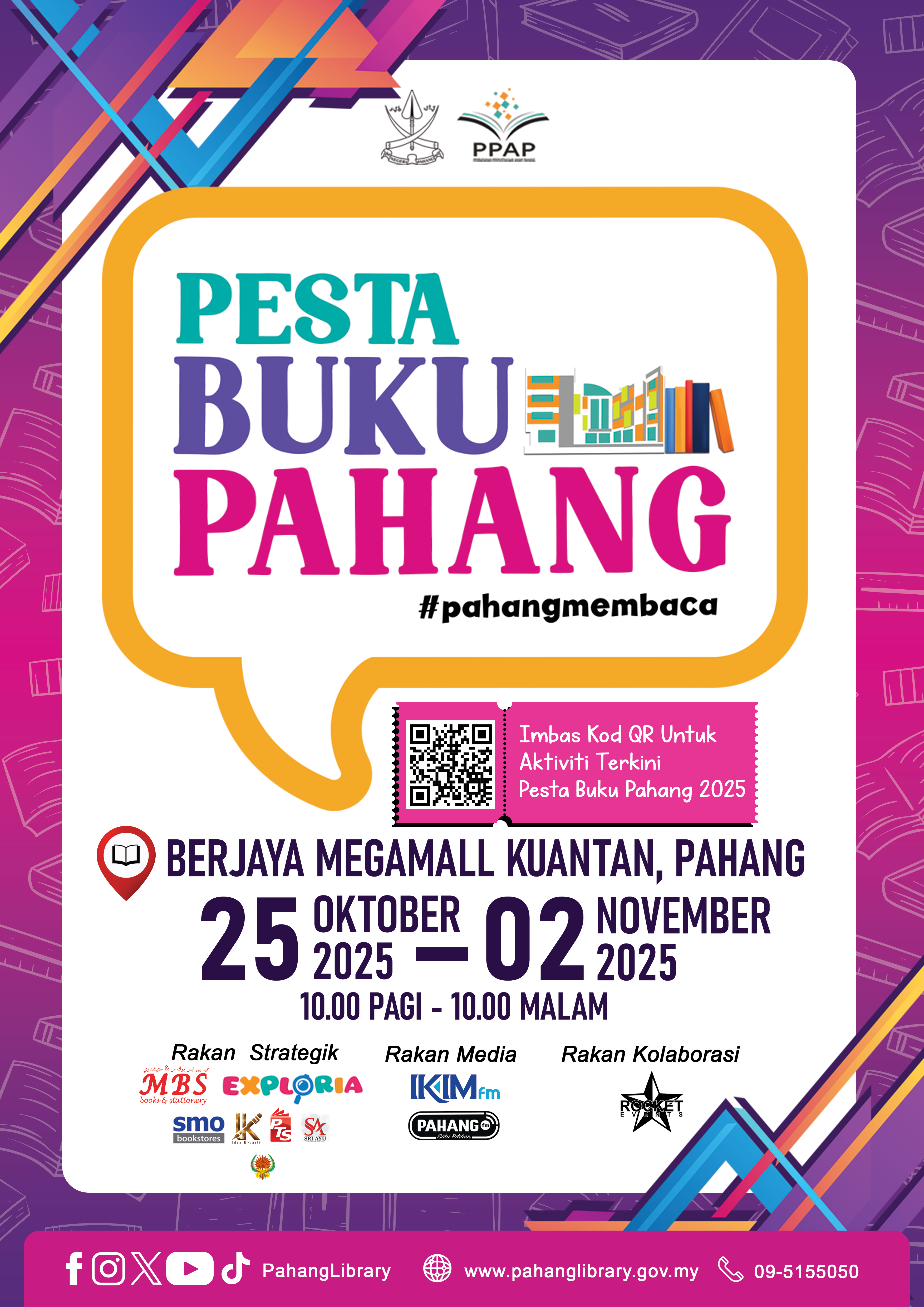 Slide 1Selamat Datang ke Laman Web RasmiPERBADANAN PERPUSTAKAANAWAM PAHANG PERKHIDMATAN PERPUSTAKAAN Moh Daftar Ahli Carian Bahan Lanjutan Pinjaman u-Pustaka Makluman TERKINI Facebook Aktiviti Terkini Aktiviti Terkini BERITA SEMASA Perpustakaan Awam Pahang Sertai Perarakan Kenderaan Sempena Sambutan Kemerdekaan 2025 KUANTAN, 31 Ogos 2025 – Perpustakaan Awam Pahang telah turut...baca selanjutnya... TAWARAN SEBUT HARGA Harap maaf, tiada tawaran sebut harga terkini. Data Terbuka Pautan Luar Aplikasi Data Terbuka Data TerbukaData Terbuka PPAP Pautan Luar Portal myGov Aplikasi MYMESYUARATMYHRMIS MOBILE MyMesyuarat Senarai Perpustakaan Awam Pahang Di Bawah Tadbir Urus Kerajaan Negeri Pahang