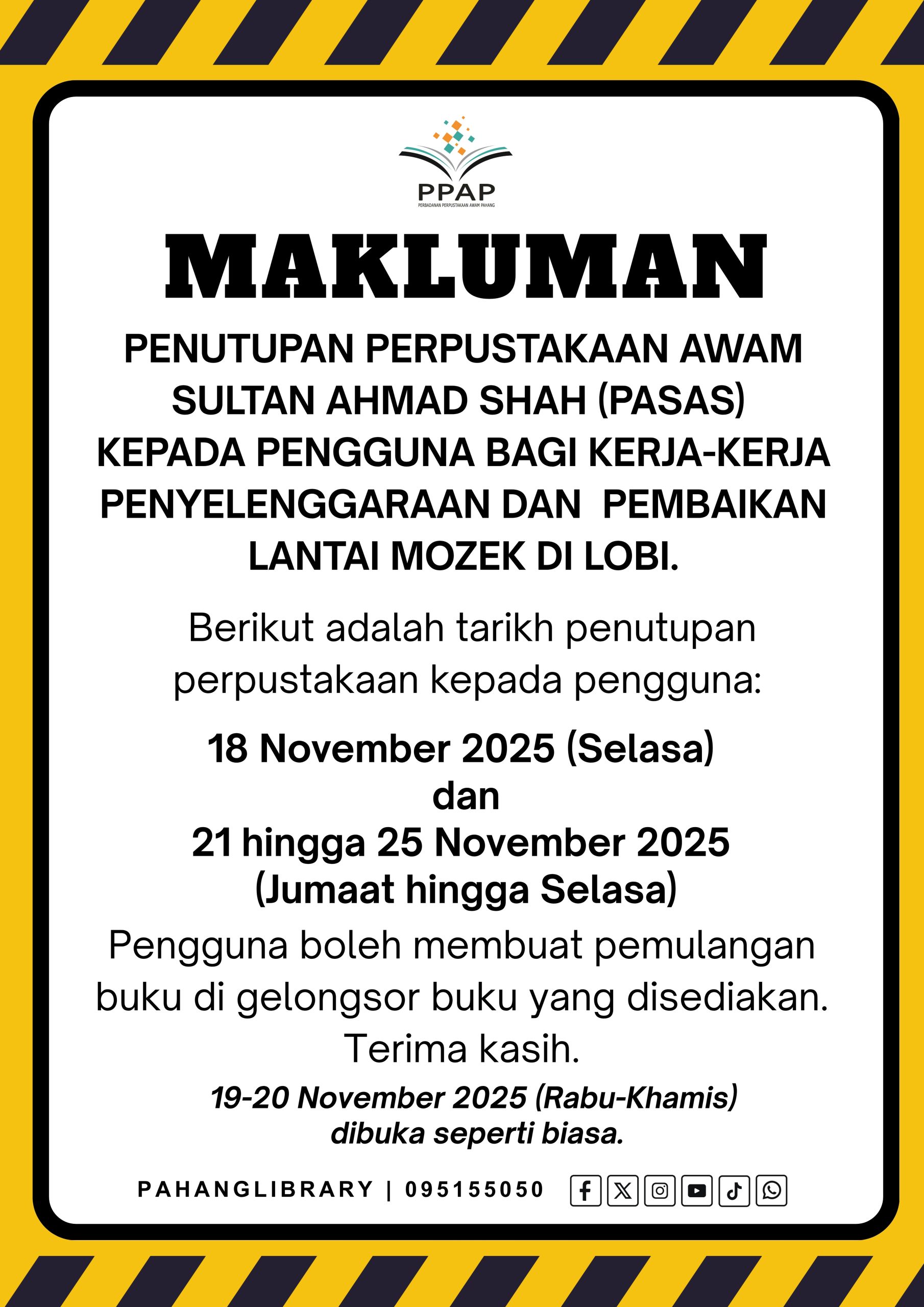Slide 1Selamat Datang ke Laman Web RasmiPERBADANAN PERPUSTAKAANAWAM PAHANG PERKHIDMATAN PERPUSTAKAAN Moh Daftar Ahli Carian Bahan Lanjutan Pinjaman u-Pustaka Makluman TERKINI Facebook Aktiviti Terkini Aktiviti Terkini BERITA SEMASA Sambutan Hari Kanak-kanak KUANTAN, 14 Oktober 2025 – Program Sambutan Hari Kanak-Kanak Sedunia...baca selanjutnya... Majlis Perasmian Pesta Buku Pahang 2025 KUANTAN, 28 Oktober 2025 – Majlis Perasmian Pesta Buku Pahang...baca selanjutnya... 1 Jam Bersama Ustazah Zayy KUANTAN, 29 Oktober 2025 – Program ceramah agama bertajuk “1...baca selanjutnya... Iklan Jawatan Kosong Iklan Jawatan Kosong Jawatan Kosong Perbadanan Perpustakaan Awam Pahang (PPAP) mempelawa warganegara Malaysia... Data Terbuka Pautan Luar Aplikasi Data Terbuka Data TerbukaData Terbuka PPAP Pautan Luar Portal myGov Aplikasi MYMESYUARATMYHRMIS MOBILE MyMesyuarat Senarai Perpustakaan Awam Pahang Di Bawah Tadbir Urus Kerajaan Negeri Pahang